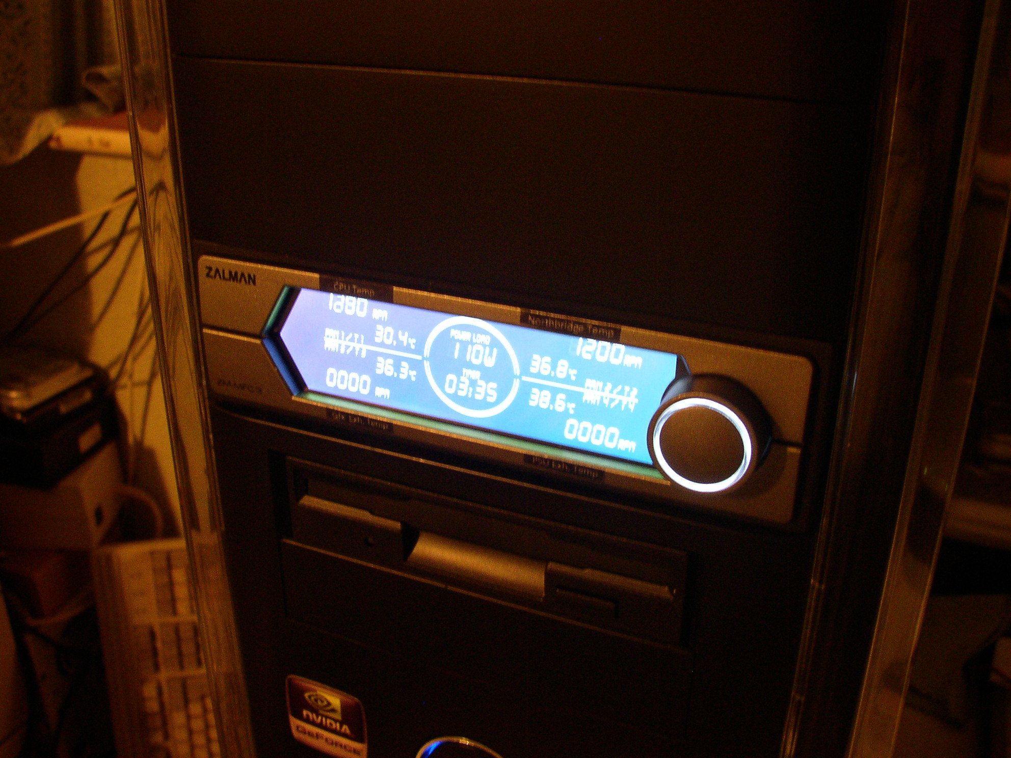 I installed a Zalman fan controller in a spare 5 1/2 inch drive bay in this system to manage thermal performance, and the controller included a VFD (Vacuum Flourescent Display) for monitoring purposes. This is now in use in the Core i7 4770K system and still going strong. I initially had repeated problems with RAM instability on this Core 2 Quad system, causing random BSoDs (Blue Screens of Death) in Windows. Reducing the DDR data rate helped, but ultimately the problem was solved by using RAM from a different manufacturer. After this, the system was stable and a pleasure to use. The following openBVE add-ons were developed on it: