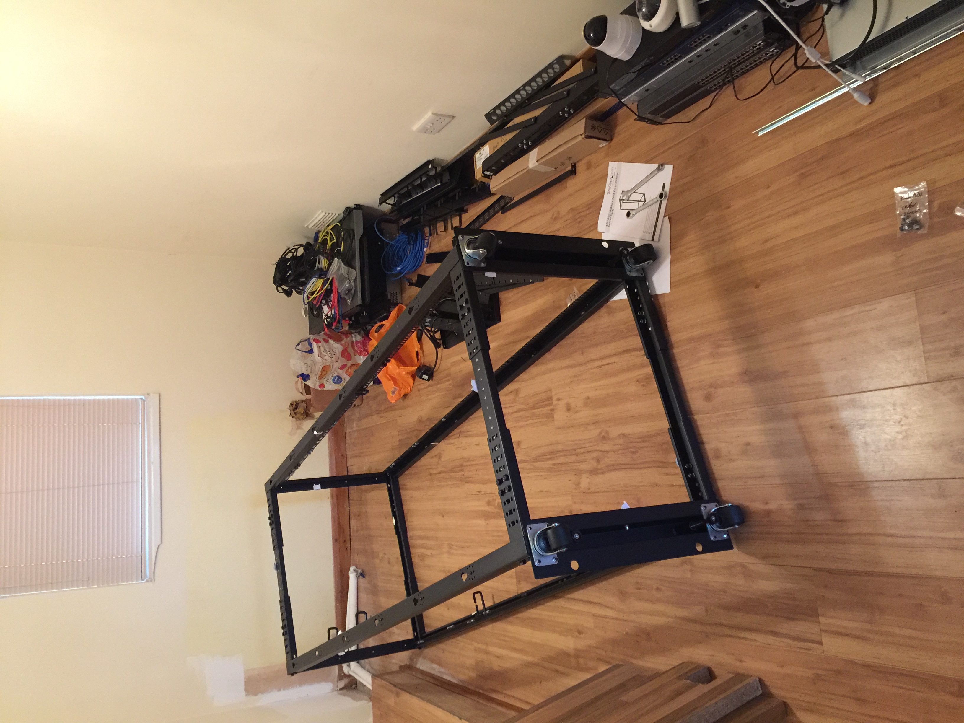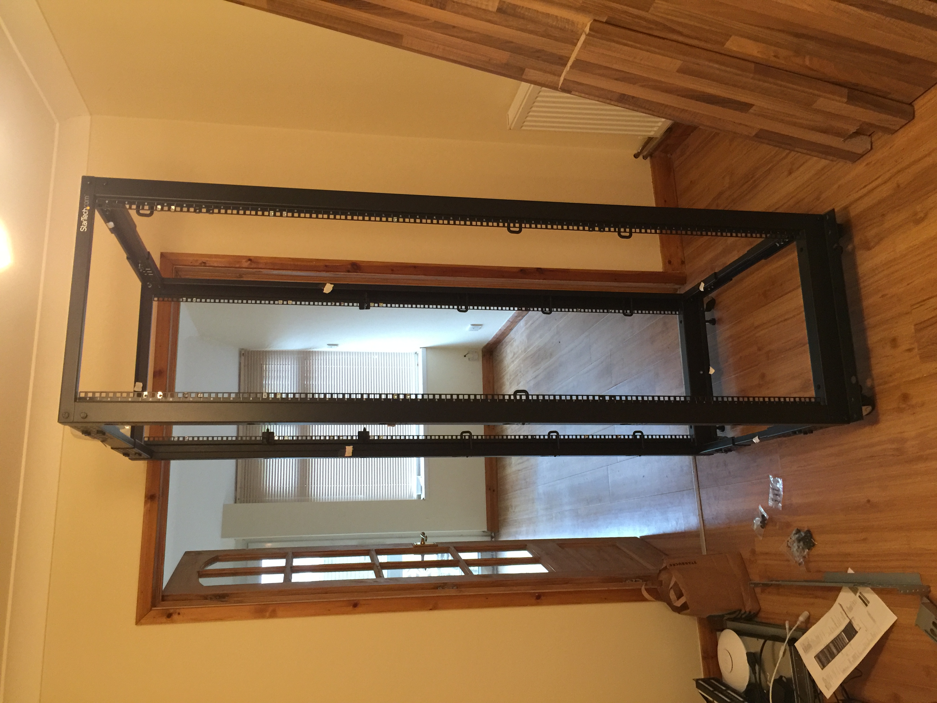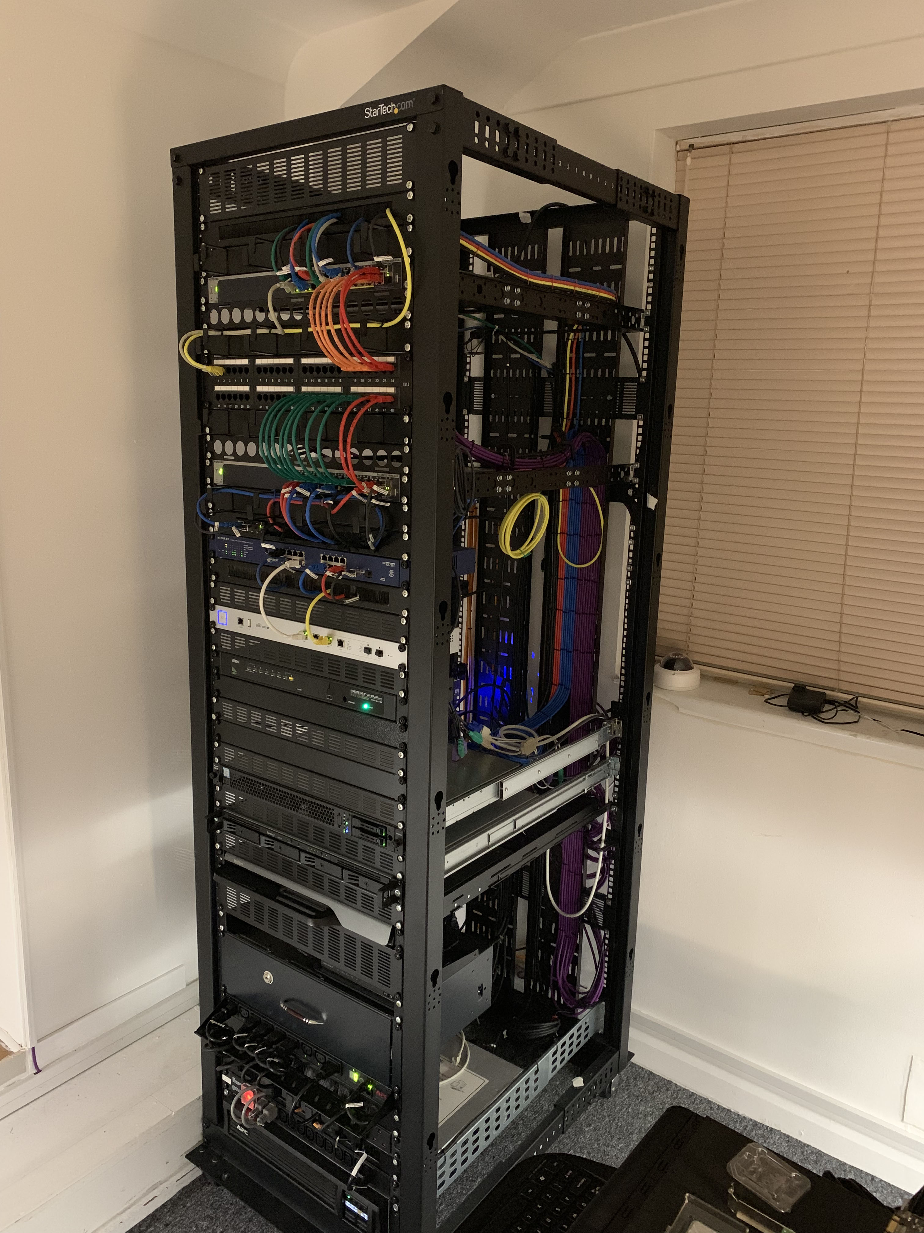 This was a great setup but was only the start. In 2017 I decided to expand the rack server with more network appliances and rack mounted gear which I could learn about. I drew up a new design and schematics for device layout, data and power configurations, and ordered a Startech 42U rack, which is of an open frame construction requiring self assembly. I then transferred the existing rack mount equipment over to the new 42U rack. I fitted a range of blanking and ventilation plates, and brush bars to the rack. I fitted a 48 port patch panel which I could use for connecting Cat 6A cables which ran externally from the rack, using an appropriate IDC punch down tool.