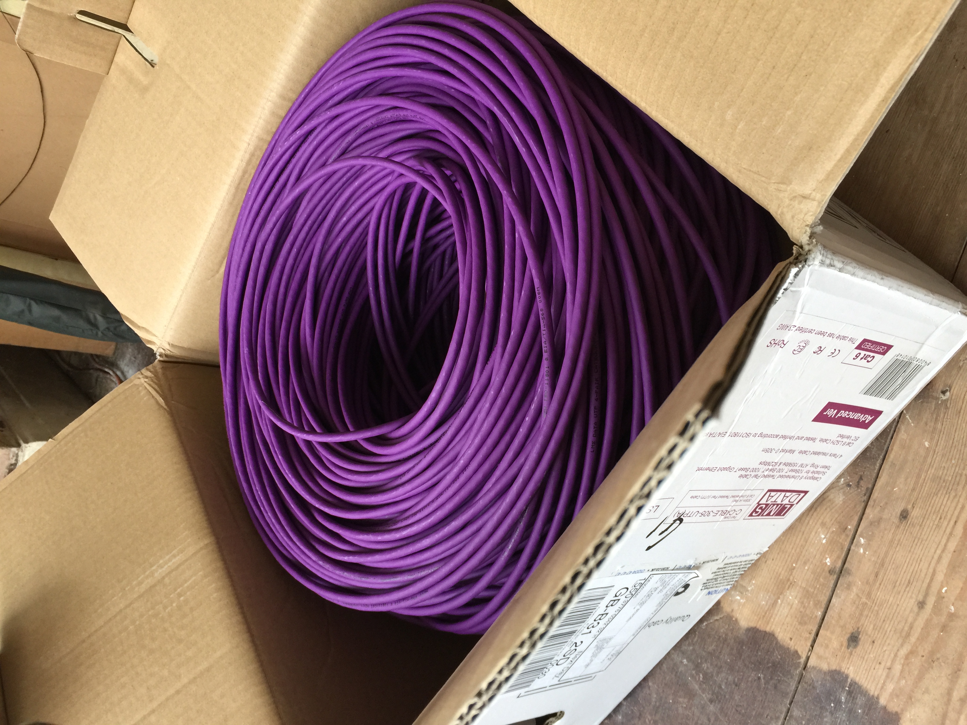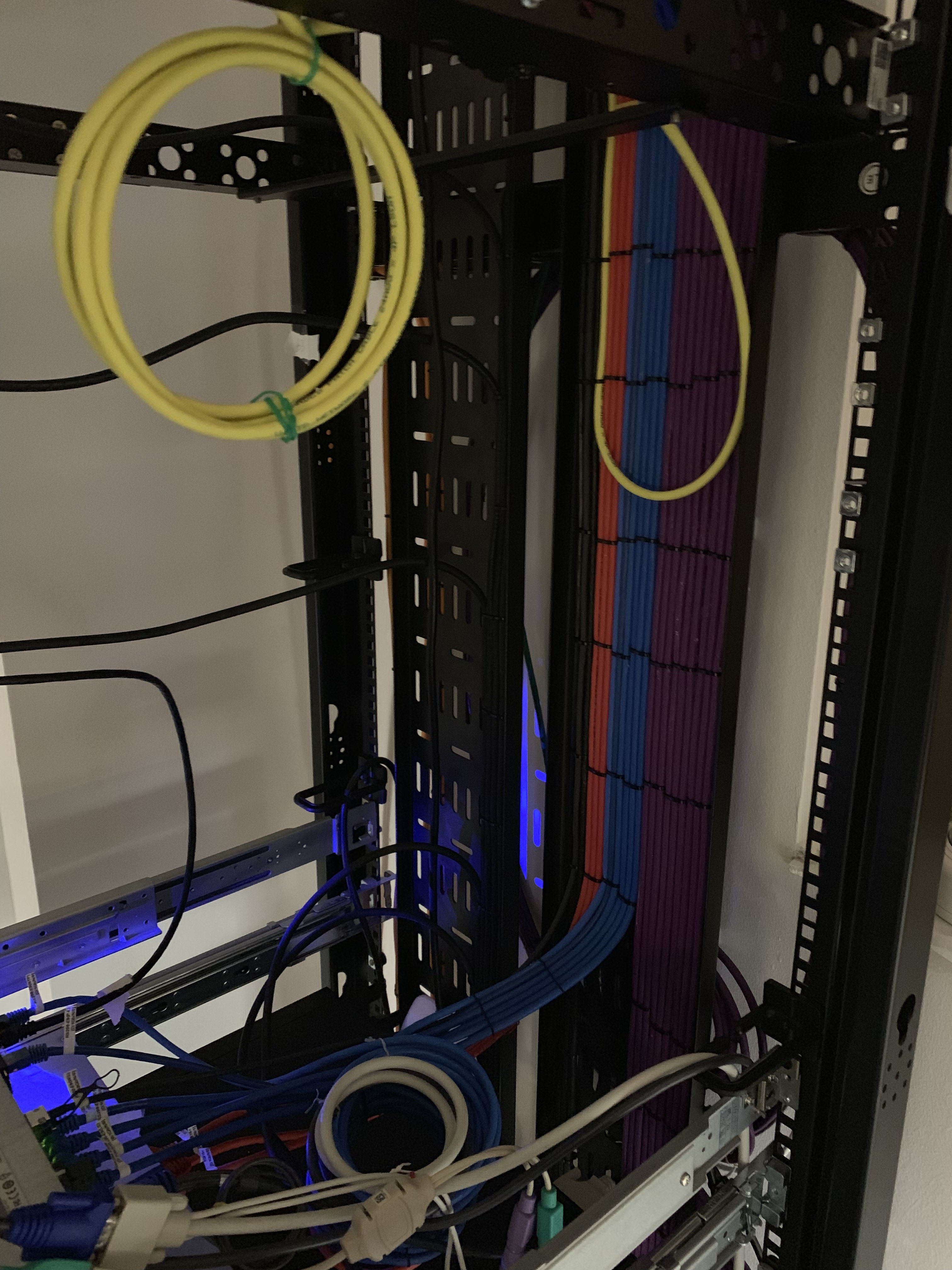 Also important is cable management, especially in a more complex setup like this. All permanently installed Cat 6A, SFP copper and power cables are tied together and bundled in groups, with data and power cables seperated where possible. All cables are identified with labels, as are all ports and RJ-45 sockets in the development office. These labels match up with the designs and schematics for ease of future maintenance and troubleshooting.