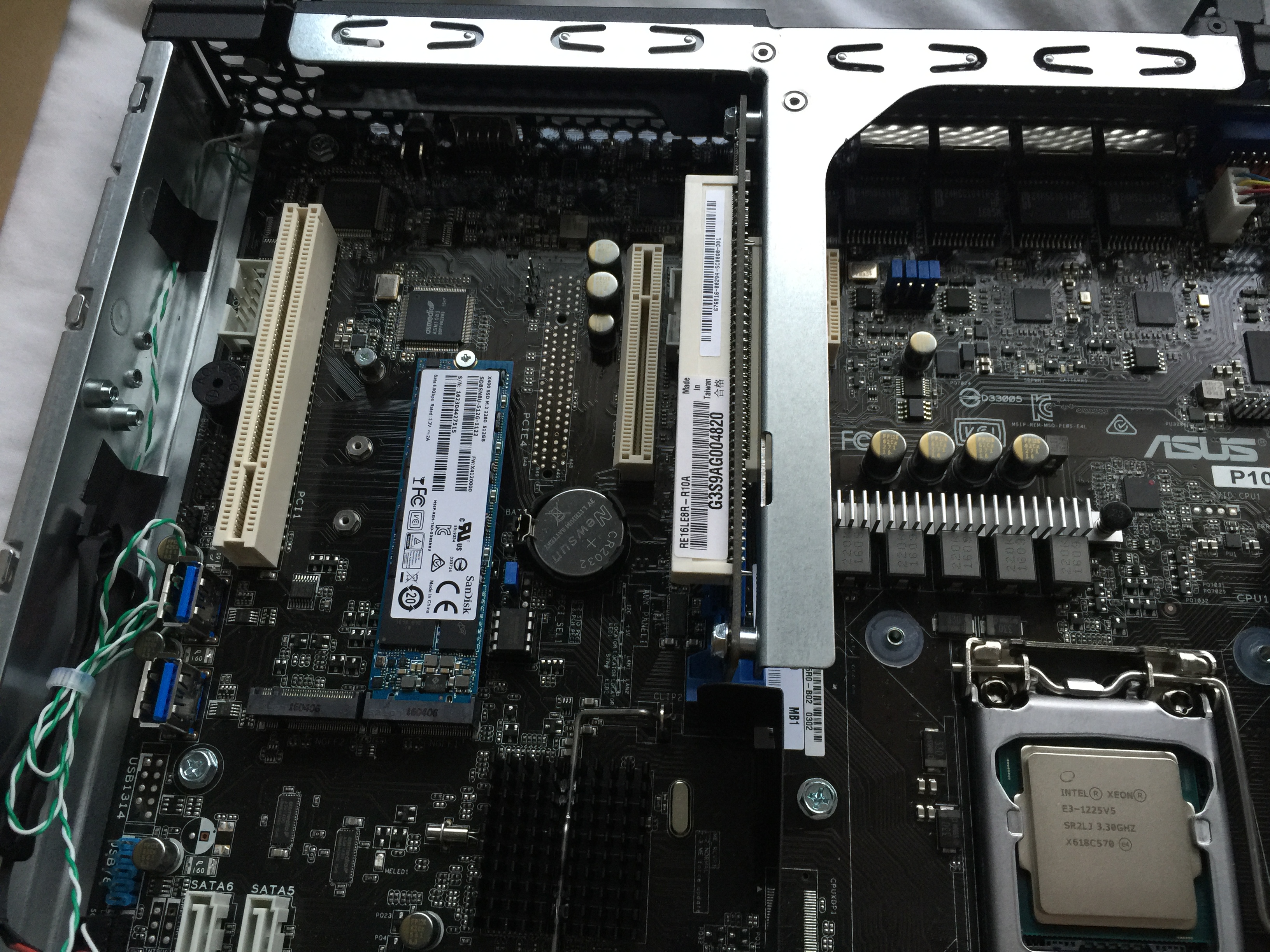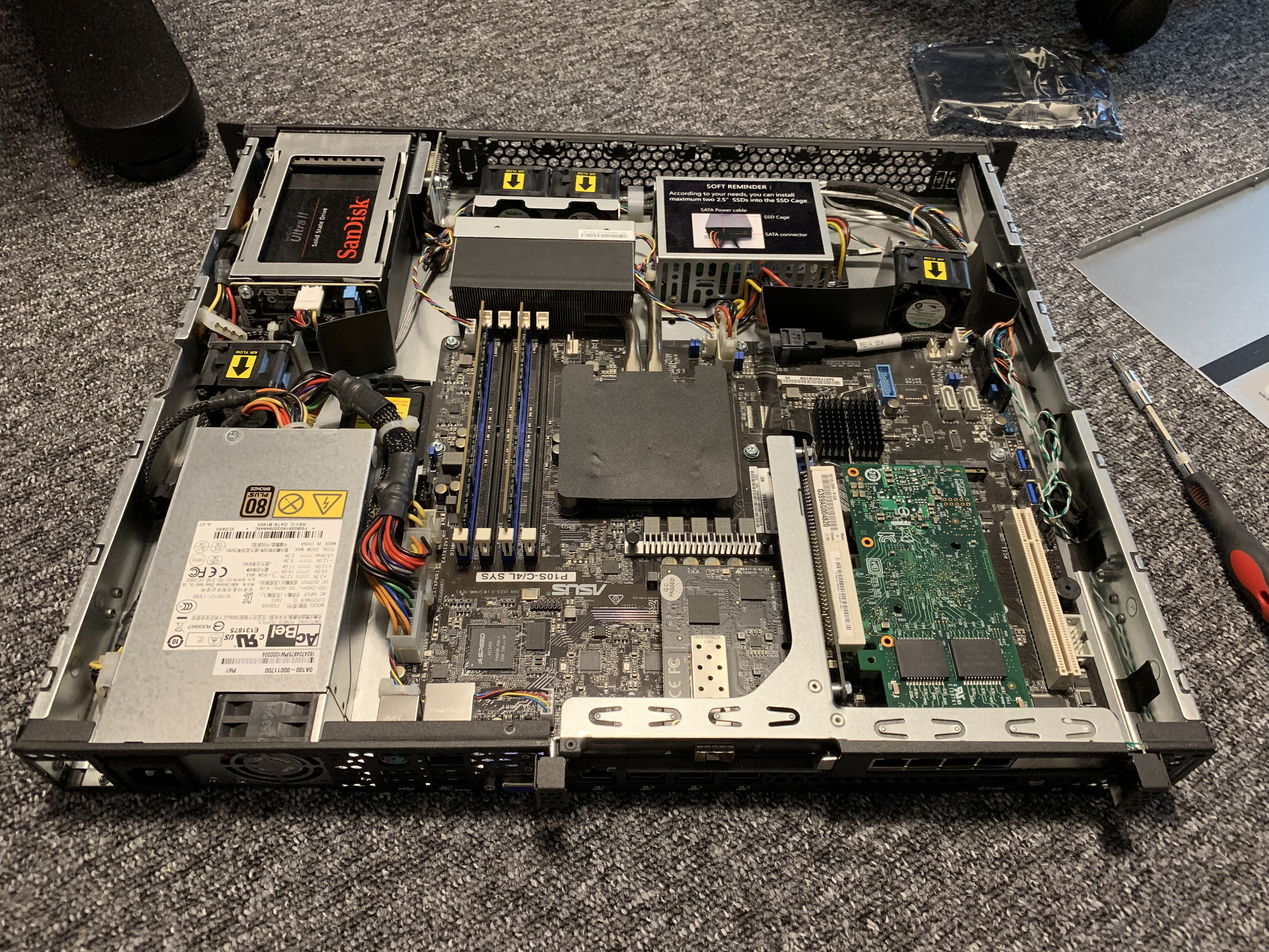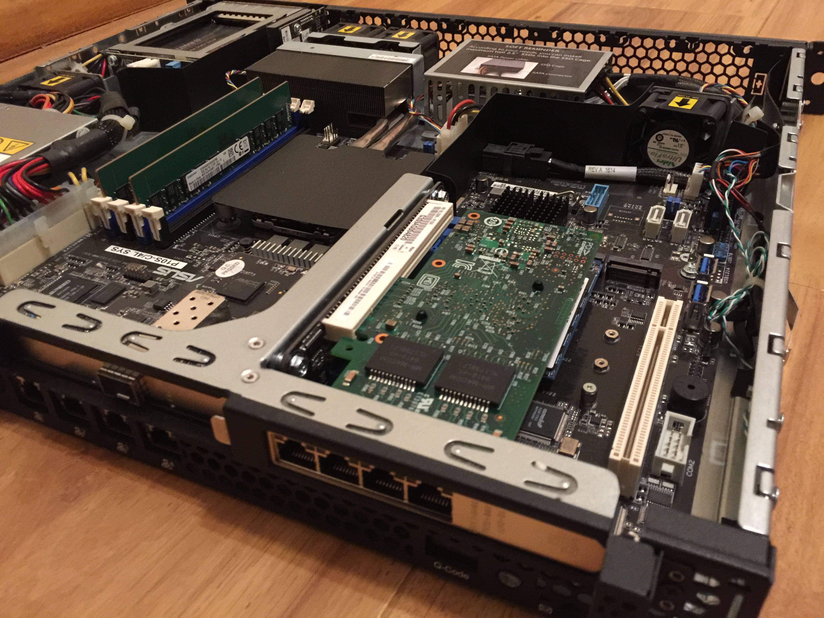 The Asus Xeon server, runs Windows Server 2016 Standard, with several Linux installations running in Hyper-V virtual machines. These each provide services including Apache HTTP and FTP, Syslog, POP3, IMAP, SMTP and Webmail, Squid Proxy, BIND name servers, and NTP. One physical ethernet port is assigned to each Hyper-V virtual machine via a "Hyper-V Virtual Switch", so I added an Intel I350-T4 4-port 1Gbps PCIe NIC for extra capacity.